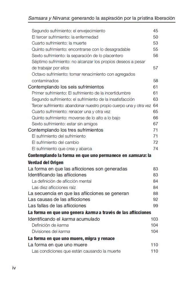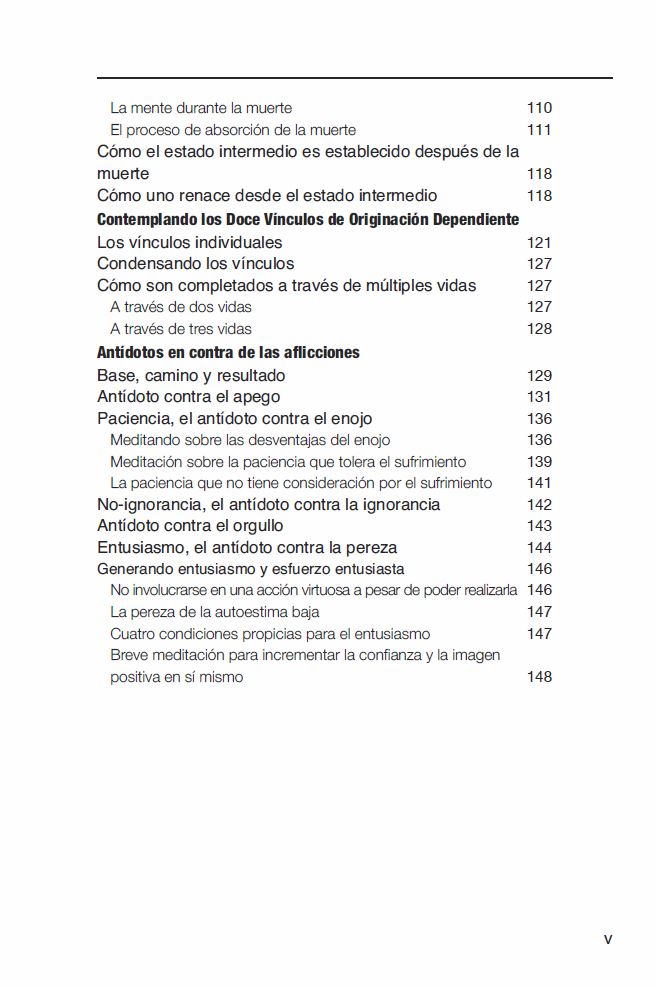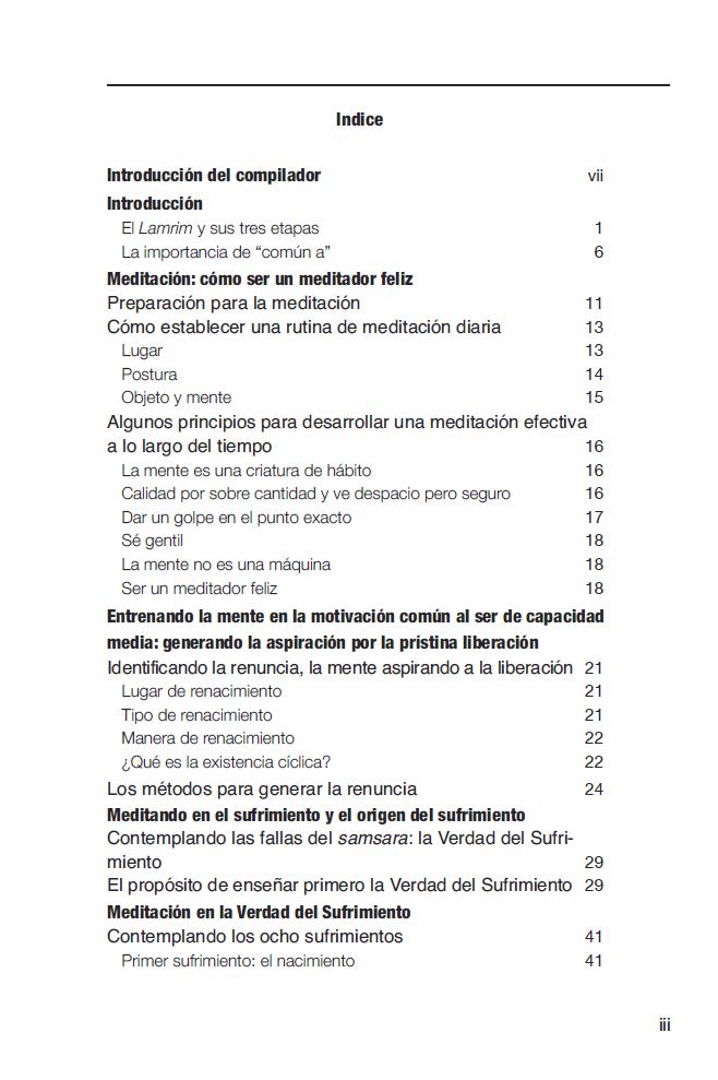 He reunido y traducido la mayor parte del contenido de este libro de diferentes textos Tibetanos tales como del Ornamento Claro de Chim Jam-pe’i Yang, Iluminación del Camino a la Liberación del primer Dalai Lama Gyalwa Gedun Drub y de la Compilación de Temas de Purbuchok Jampa Tsültrim Gyatso. Algunos de estos pensamientos son míos, sin embargo están basados en dicho material. Yo soy enteramente responsable por cualquier error.