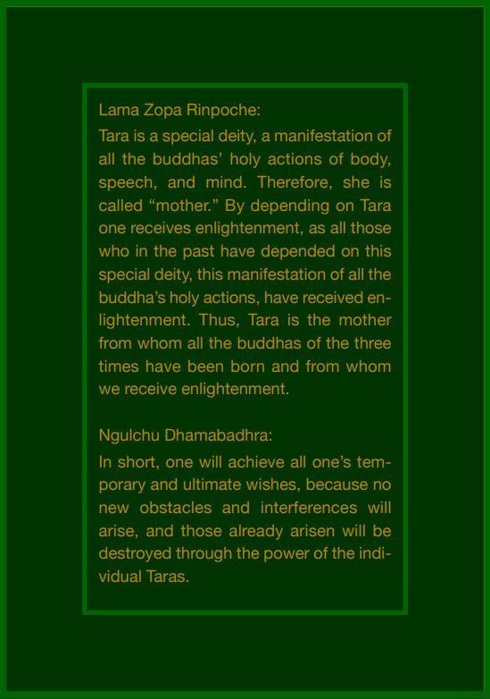 It was later supplemented with passages from the First Dalai Lama’s commentary on the Twenty-one Taras, called the Precious Garland, as well as some additional quotes from Ngulchu’s commentary.